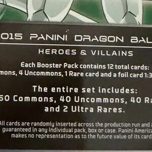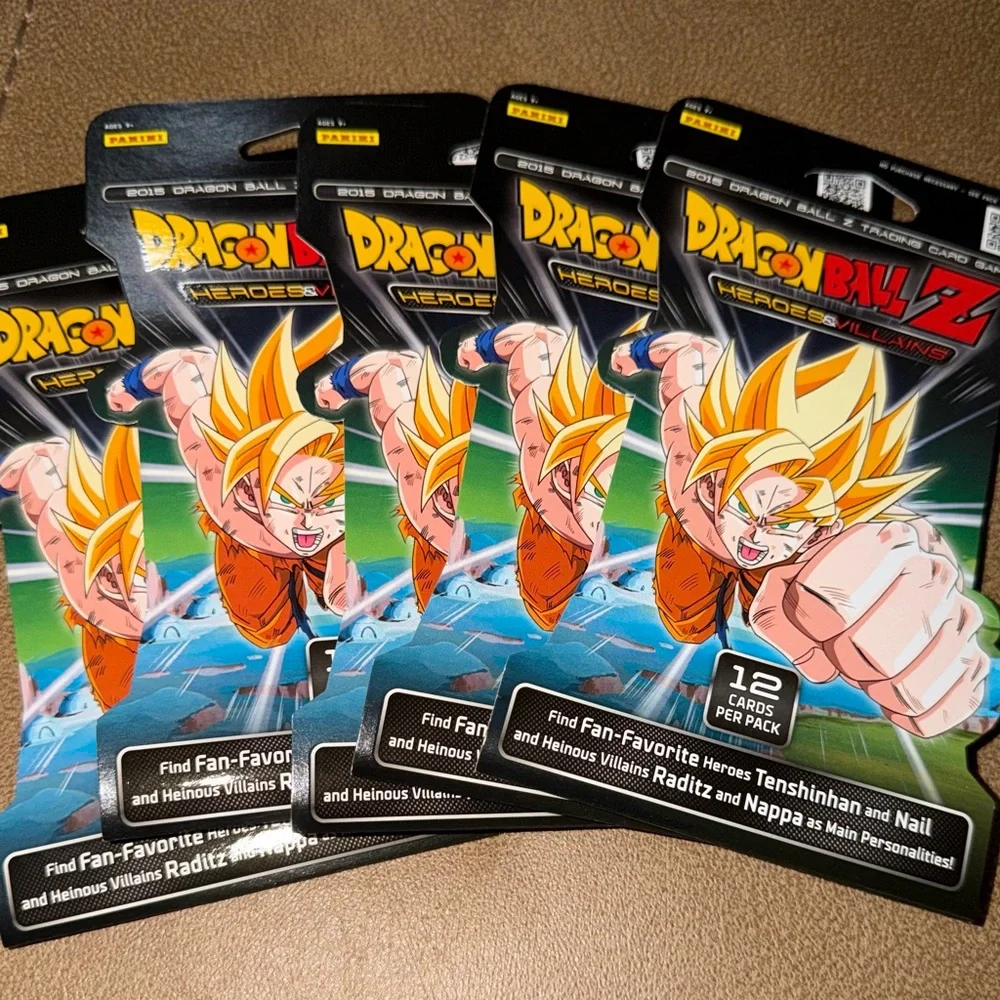 2015 Dragon Ball Z Trading Card Game: Heroes & Villains sleeved booster pack produced by Panini. Each pack contains 12 cards and features characters like Tenshinhan, Nail, Raditz, and Nappa as potential "Main Personalities".