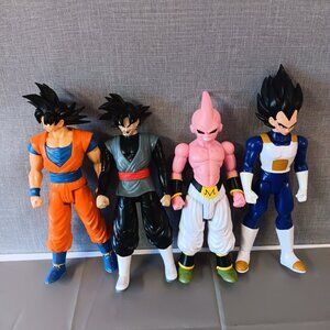 Up for sale is an awesome lot of Dragon Ball Z large action figures, featuring four iconic characters. Each figure measures about 11ish inches tall. There are: Goku (orange gi), Goku Black (black gi), Majin Buu (pink), and Vegeta (blue/white armor). These impressive figures are a fantastic addition for any Dragon Ball Z fan or collector. I think they're in nice used shape with very little use. There are some markings mainly on the pink guy but again, nothing so horrible as to throw out. I think these would be nice displayed or to used and played with again. So, relive your favorite battles and sagas with this powerful team of heroes and villains. Don't miss this opportunity to own a piece of anime history! Thanks for looking!