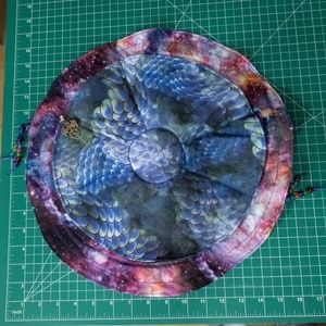 This large DND Bag, flattens out to 16," and ruffles closed to hold your necessary accessories with a drawstring of satin cords through 2 eyelets. Handmade DND Bag, padded inside with blanket fabric to help keep your tabletop and treasured dice safe from dings and nicks. The outer fabric is cotton with colorful dragons and the interior fabric is a galaxy print and the center is water resistant dragon scale print fabric. The bag is decorated with beads on the drawstrings and has a dragon charm sewn on the inner ring of pockets. Use it flat to roll your dice or gather up the sides in order to have a edge to stop your dice from rolling away. Perfect for Dungeons and Dragons dice game, rpg games, any board game requiring dice.