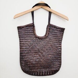 The "NS Diagonal Triple Jump" is a shoulder bag that stands out with its handwoven buffalo calf leather and stylish vertical design. It's deep, unlined, and has an open top, making it easy to fit everything you need. The braided handles not only look great but are comfortable to carry too. This bag gives off Nantucket tote vibes but in a fresh, vertical twist. It’s perfect for anyone looking for a blend of casual elegance and practicality.