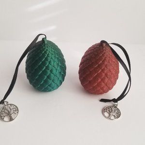 Fans of Game of Thrones, Harry Potter, Dungeons and Dragons, and general fantasy lore will love their very own dragon eggs! You are buying a set of two. One is a deep emerald green, the other a deep red/rusty wine color. Both have a subtle sparkle, and are pre-strung with black ribbon and a BONUS medieval tree charm. Ready to hang on your Christmas or holiday tree, or hang it in your home to enjoy all year. Both eggs have a flat base so they can rest on a table without falling over. Not intended as a toy. Made of 3D printed sparkly plastic filament. Colors may vary slightly from photos due to lighting and your computer monitor settings