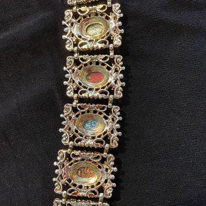 Vintage bracelet contains six stones that resemble "dragon eggs" set in an ornate frame. Bracelet measures 8 inches and is shiny gold tone with black detail