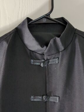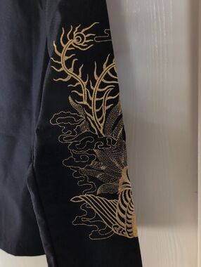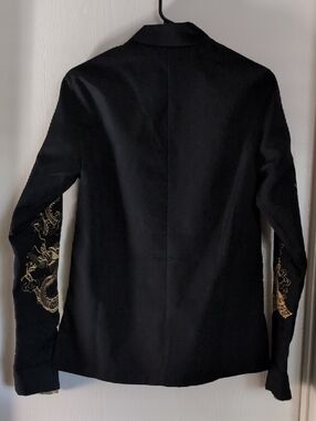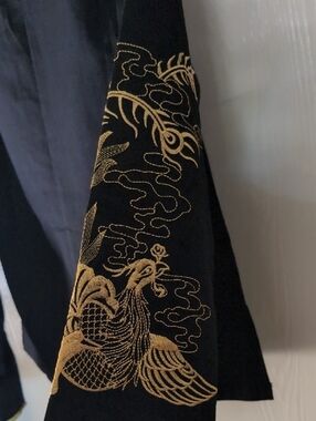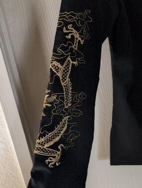 Traditional Chinese jacket. It has an embroidered dragon and peacock on the arms. It is a size M for men but it was a bit small for me (6ft, 170lbs). It's brand new.