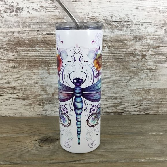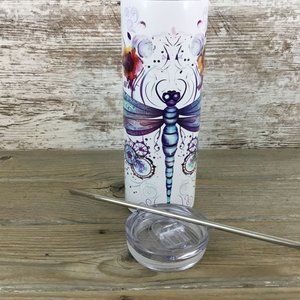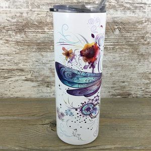 Pretty Dragon Fly and flowers on this 20 oz Skinny Tumbler.