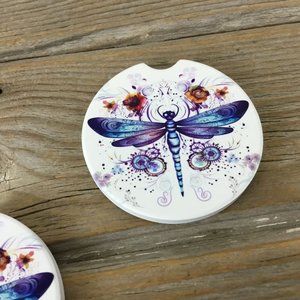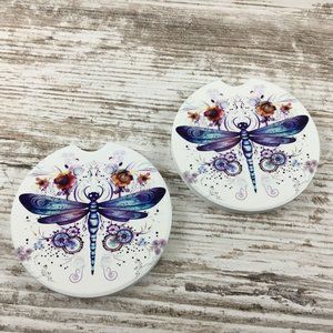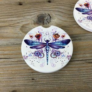 Pretty Dragon Flies and Flowers on this set of 2 Car Coasters.