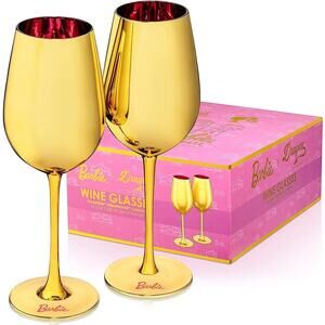 Stemmed Wine Set: These stunning wine glasses feature iconic Barbie Dreamhouse colors and style to give you the ultimate Barbie experience at home; comes with two gold metallic glasses with pink interior embellished with signature Barbie branding on the base