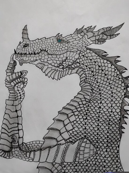 An ink and shaded drawing of a dragon deep in thought.