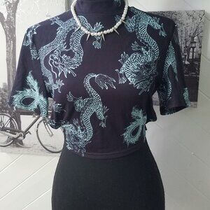 Selling this because I have two! Awesome dragon patterned black and blue crop, super soft and stretchy material, fits a S-M Women's. The back is open and ties at the waist, the collar is closed.
