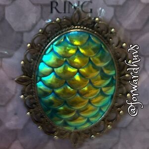 Introducing the Dragon Scale Ring, a bold and fun piece that adds a striking statement to any outfit. This costume ring is designed to captivate with its intricate dragon scale pattern, making it perfect for those who love to stand out. New in its original package, this ring is pristine and ready to enhance your jewelry collection with its unique flair.