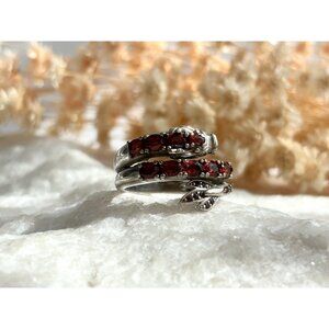 Lovely sterling silver vintage garnet gemstone adorned ring. The ring is in the shape of a dragon with varying sizes of garnet. Super cool concept. All stones are set in prongs. Marked as sterling and tested positive as such via chemical testing. Gorgeous ring with so much character.