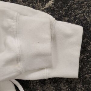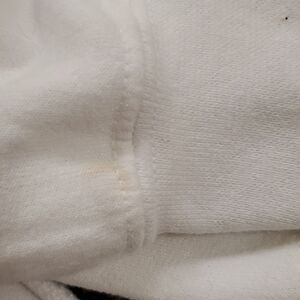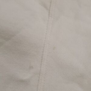 Pre-owned, no holes or tears, light spot on lower back, pocket, left cuff, and left sleeve ... see pics.