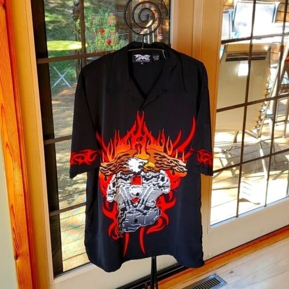 Dragonfly Clothing Co. Fire Eagle Skull Motor Buttondown Short Slv Sz XL Shirt