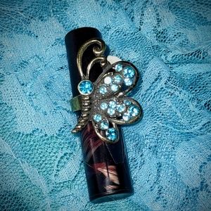 Antique gold-colored metal base with dragonfly designed in aquamarine blue rhinestones.