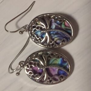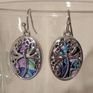 Dragonfly Dangle Hook Earrings Silvertone Abalone Shell