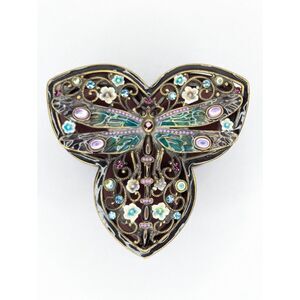 Dragonfly Shaped Frosted Glass Trinket Jewelry Box with Metal and Enamel Lid Embellished with Crystals