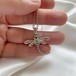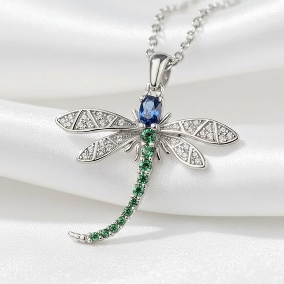 Dragonfly Insect Blue Green Clear CZ Silver Sparkly Fashion Pendant Necklace NWOT