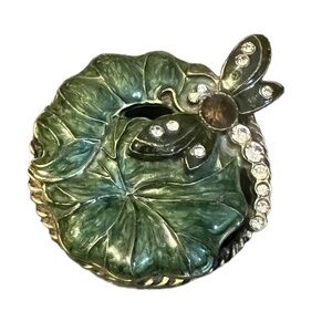 Dragonfly Lily Pad Green Enameled Metal Rhinestone Heavy Trinket Box,