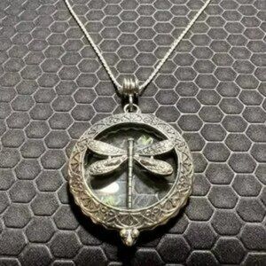 A stunning silver locket featuring a charming dragonfly design enclosed in a circle with delicate swirling accents. This locket is 2.0 inches by 2.0 inches and comes with a 22-inch Sterling Silver Rope Chain.