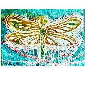 Delicate and Graceful Dragonfly Monoprint, 1 in a Series of 2. Signed by the artist (me!). Rendered in turquoise blue, crimson red, a bit of green and softly metallic gold for the gossamer wings (difficult to capture in photos). This print was made using a carved/etched wood block overlaid with wispy grasses picked from the desert then hand inked and rolled thru an etching press on heavy (140 lb.) watercolor paper. This process produces an embossed surface with good relief. Image comes with bevel-cut black matte and white backer board in a clear plastic protective sleeve. Image is 6.5" x 4.5"; matte is 8" x 10". Ready and waiting to be framed to compliment your personal style - looks great coupled with the Beaded Lizard print, also here in my closet!