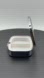 Has two separate compartments for items. Silver tone. Rectangle shaped.