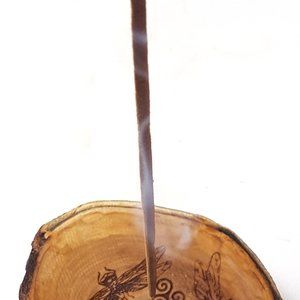 This handmade handmade wooden tree slice incense stick holder is laser engraved with our original Celtic Dragonfly Triskelion design.