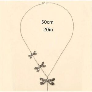Gorgeous and uniquely designed dragonfly necklace in silver tone. Main dragonfly pendant and 2 smaller dragonflies on necklace. Measurements in photos. Just a unique and fun piece that is a lovely addition to any collection.