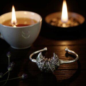 Forged in silver’s cool glow, this cuff cradles a moon‑shaped Dragon’s Blood stone — a talisman of courage, vitality, & grounded magic.