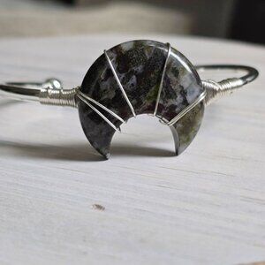 Forged in silver’s cool glow, this cuff cradles a moon‑shaped Dragon’s Blood stone — a talisman of courage, vitality, & grounded magic.