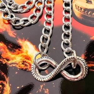 Dragons Tail SilverToned Infinity Symbol Pendant Necklace DND Inspired 19” Stylish silver toned necklace featuring an infinity pendant made from a dragons tail. Ideal for any dungeon master or dungeons and dragons fan and player. 19” aluminum curb chain and stainless steel pendant Lobster clasp closure. Size see picture with US quarter.