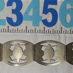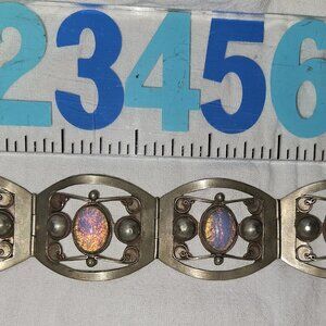 From the heyday of Mexican silver craftsmanship, this "dragon's breath" -- opalescent foiled glass -- bracelet of four panels and four oval stones wears lightly on the wrist. The mark on the tongue-and-clasp closure shows it to be made in Mexico but does not note it to be silver, hence my thought that it might be "alpaca silver," a nickel-based metal with a matte sheen. A couple of the domed parts are "dimpled," as you see, by virtue of wear. Your questions welcomed.