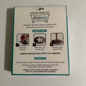 DrainWig catches hair to prevent clogs in showers. Simple installation without tools. Lasts 2 to 4 months before replacement is required.