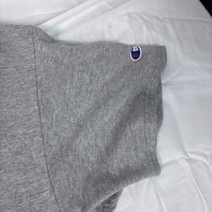 Details: Tagless printed neck label, Champion script logo printed inside neck, embroidered Champion "C" logo patch on left sleeve, soft knit fabric, blank back.