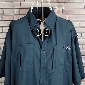 100% nylon polyester fast drying fishing shirt By Drake in a relaxed fit with short sleeves, a vented mesh yoke, and two front pockets. Great pre-owned condition.