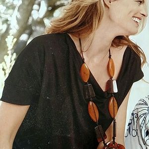 Unique top, one elbow length sleeve and the other is a short sleeve. Neckline is fun, can be worn off the shoulder. Loose fitting and comfortable.