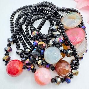 Dramatic 56” Black Bead & Dyed Agate Flapper Length Necklace Evening Sparkling