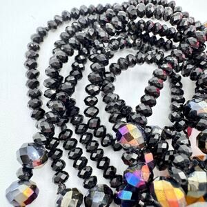 Unsigned. This necklace features small faceted black beads that sparkle in the light, accented by larger faceted oil slick beads. Faceted round and oval dyed agate beads in various colors finish off this dark, dramatic slip on style long flapper length necklace. Can be worn as a single strand, doubled, or knotted.