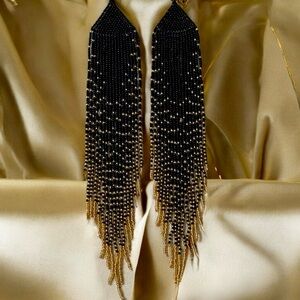 These striking earrings feature a dramatic cascade design with black and gold glass hand beaded strands that create a long, flowing fringe effect. Gold-toned glass and metal accents at the add a contrasting metallic element, enhancing the elegant pointed tip. The combination of black beads and gold details makes these earrings a bold statement piece. Sexy and flowing. A little over 9” long.