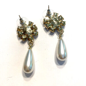 Dramatic Gold Pierced Earrings Drop & Dangle Pearl Teardrop & Blue Rhinestones