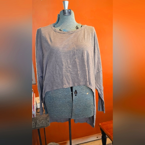 Thin gray high-low shirt- the front is essentially a crop top and the back a tunic. Super cute with a bandeau underneath! EUC.