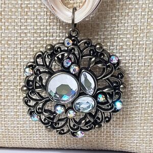 Pendant is a large bronze cutout design with sparkling Aurora Borealis Crystals and resin stones.