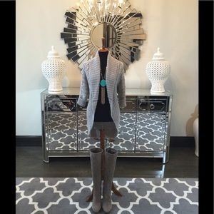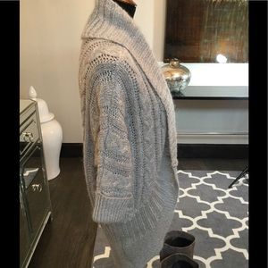 Gorgeous sweater jacket. Beautiful grey and silver Knit fabric. Drapes and flows effortlessly. 3/4 sleeves perfect to dress it up. Perfect movie night Sweater over skinny jeans!