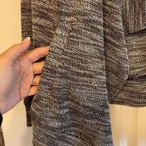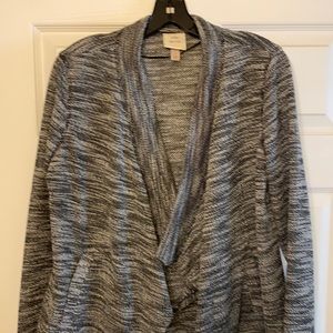 Tweed looking, black and white with a small silver thread through out. Can be dressed up or down! Drape front with pockets but no zippers or buttons.