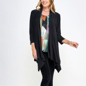 Elegant yet easygoing, this quarter-length sleeve jacket is designed with a soft, draped front that moves with you. Crafted from stretch-rich ITY fabric, it layers beautifully over both dressy and casual ensembles. Its open-front design makes it a seasonless staple for polished layering. Proudly made in the USA.