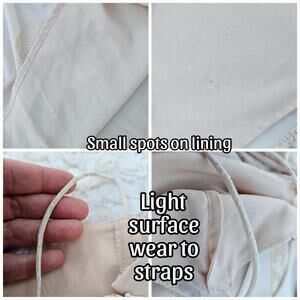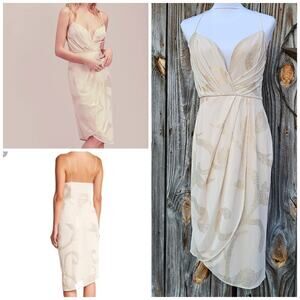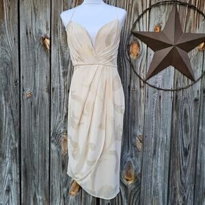Light neutral champagne cream color mesh sheer stretch fabric w/ distressed gold foil print in a floral vine swirl print. Midi length w/ asymmetrical hemline. Sweetheart neckline w/ plunge, ruched bodice & beautiful draping details, faux wrap front skirt w/ folded pleat detail. Sleeveless with delicate spaghetti straps, side zip, full lining. Bodice has boning, plunge detail is wired for structure. Issues noted in photos. Excellent preowned condition, overall. Size 12 by Free People Style: Venus Party Dress Draped Midi Wrap