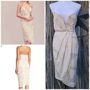 Light neutral champagne cream color mesh sheer stretch fabric w/ distressed gold foil print in a floral vine swirl print. Sweetheart neckline w/ plunge, ruched bodice & beautiful draping details, faux wrap front skirt w/ folded pleat detail, asymmetrical hemline.Sleeveless with delicate spaghetti straps, side zip, full lining. Bodice has plunge detail that is wired for shape/structure. Issues noted in photos. Center Label has been marked through. Excellent preowned condition, overall. Size 4 by Free People Style: Venus Party Dress Draped Wrap