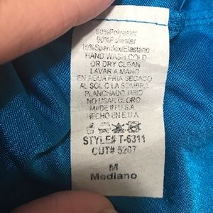Pictures above were taken as a reference so you can see how it could look on a person. The front drapes down so a little cleavage shows. The back is totally opened and designed by what looks like a silver bracelet. I can describe the color as turquoise and the feel is close to sheer. I wore this twice.