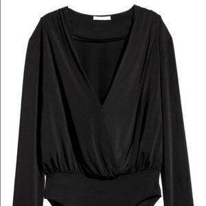 ✨ V-neck bodysuit in airy jersey with a slight sheen. Gathers at shoulders, long sleeves, and draping at front. Seam at waist and lined gusset with snap fasteners.
