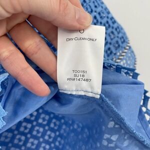 Draper James 6 Lattice Double Bell Sleeve Top TO0151. Blue with striped contrast details at sleeves. In great pre-owned condition with no flaws to note other than a few marks on inner tag (likely from dry cleaning).