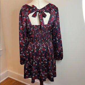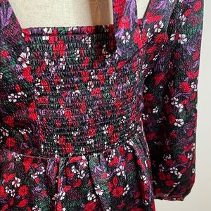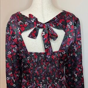 Beautiful NWT Draper James “Belle Meade Black” floral dress, featuring a romantic red, purple, and white flower print on a subtly textured fabric. The back showcases a charming keyhole cutout with a self-tie bow, smocked bodice for comfort, and long sleeves with gentle volume.