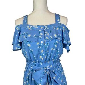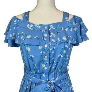 Draper James Blue Daisy Floral Printed Maxi Cold Shoulder Ruffle Top Tie Waist Size 0. Runs large see photos for details and measurements. Excellent condition. Beautiful blue with white daisies. Styled with cold shoulders, airy ruffles and a tie waist, it's as flattering as it is feminine. Blue floral printed crepe (100% Polyester). Maxi. Short sleeves cold shoulder. Square neckline. Exposed front button down placket. Partially lined. Elastic waistband. Comes with tie belt. Great for vacation, beach, wedding, reception, summer, spring, date night, elegant, romantic